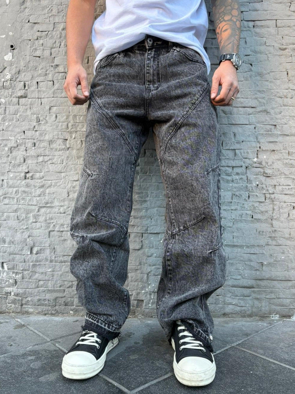 Jeans grigio acid wash con design geometrico, dettagli raw-cut e zip alle caviglie, Mod. Flare.