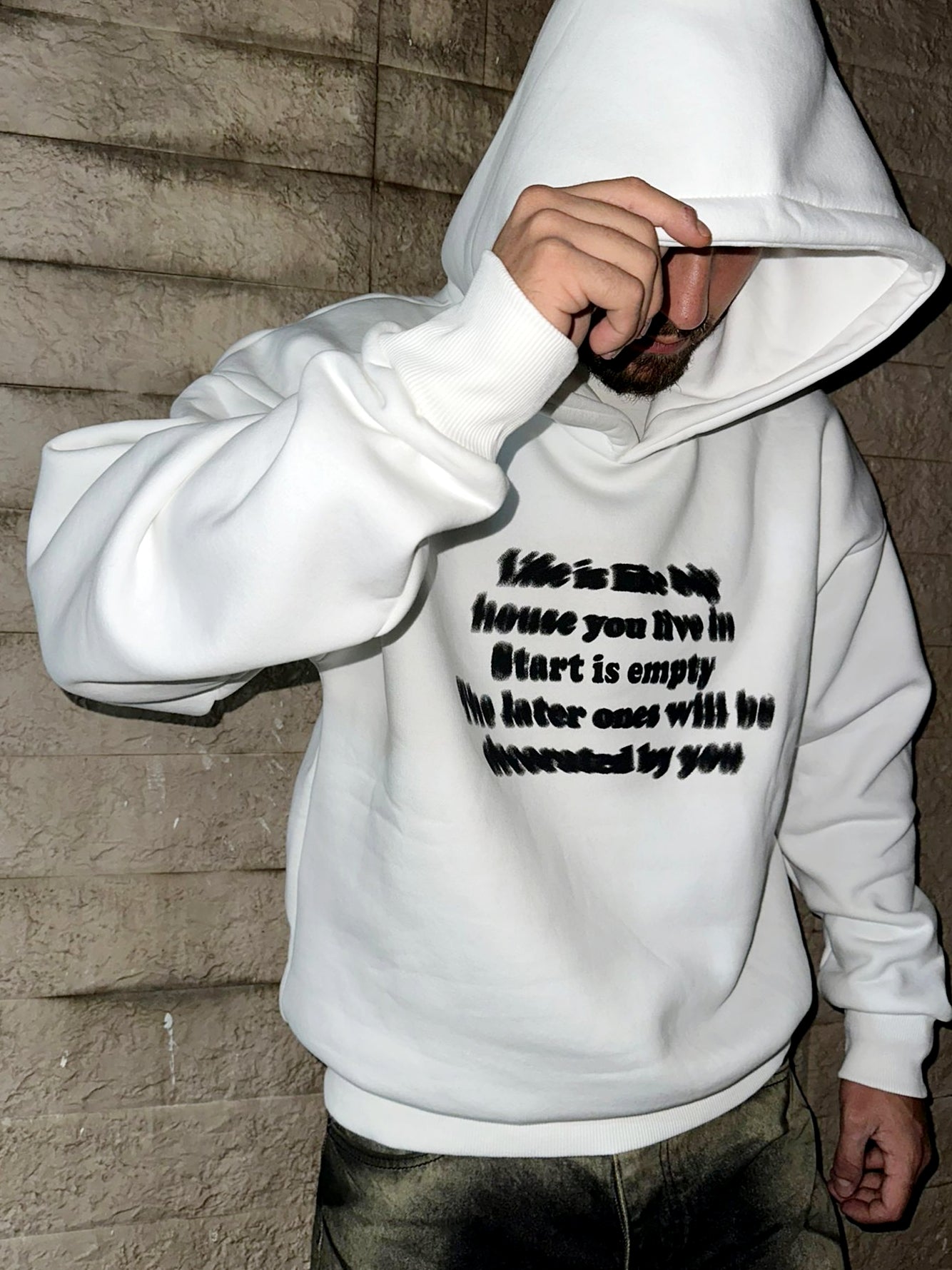 La Felpa Blur White porta il concetto di streetwear a un nuovo livello visivo.