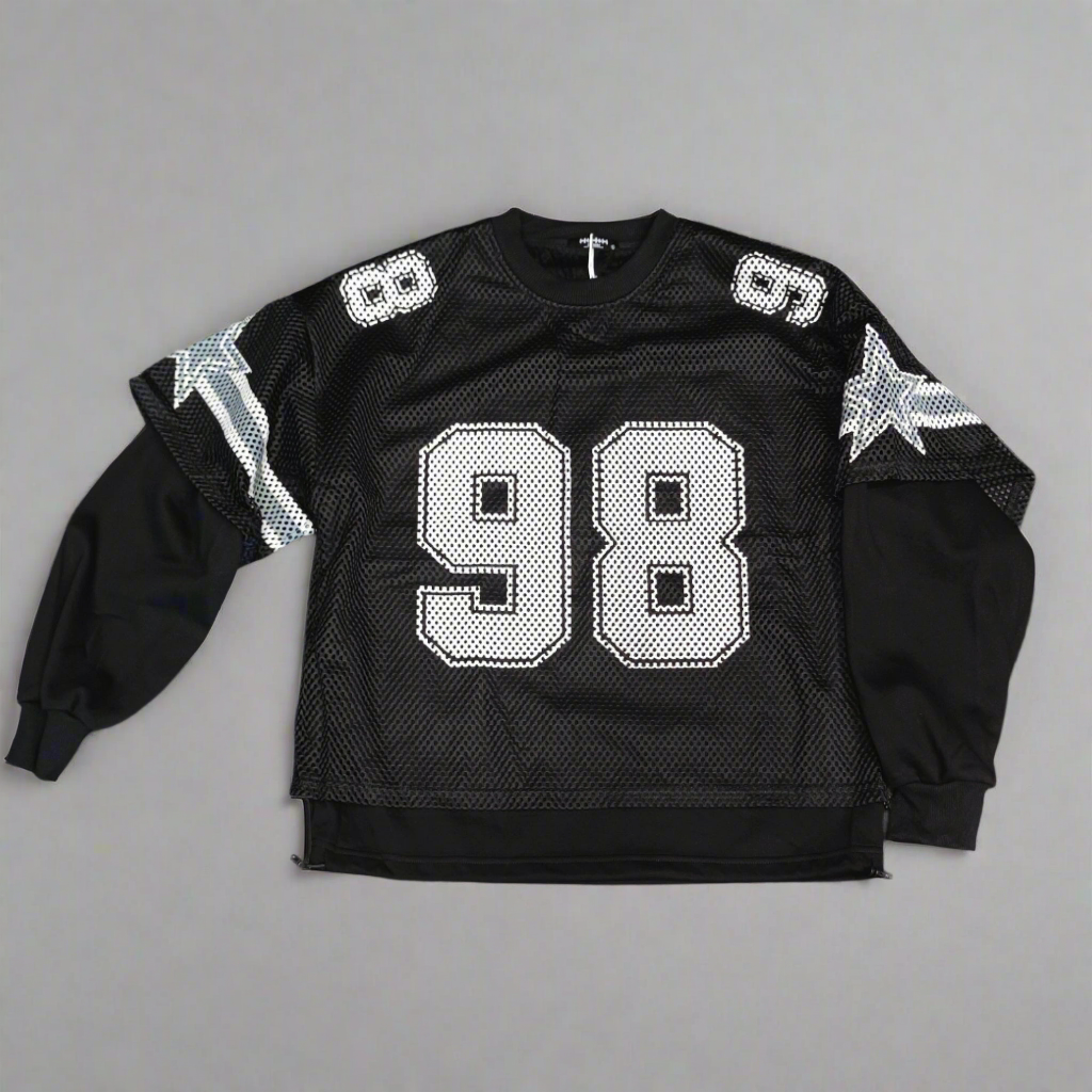 Porta il vero vibe street con questa felpa oversize effetto layered. Lo stile sportivo del mesh nero con maxi numero 98 si unisce al comfort del tessuto nero sottostante, creando un look unico e di carattere. Perfetta da abbinare a jeans e sneakers per un outfit urban deciso.