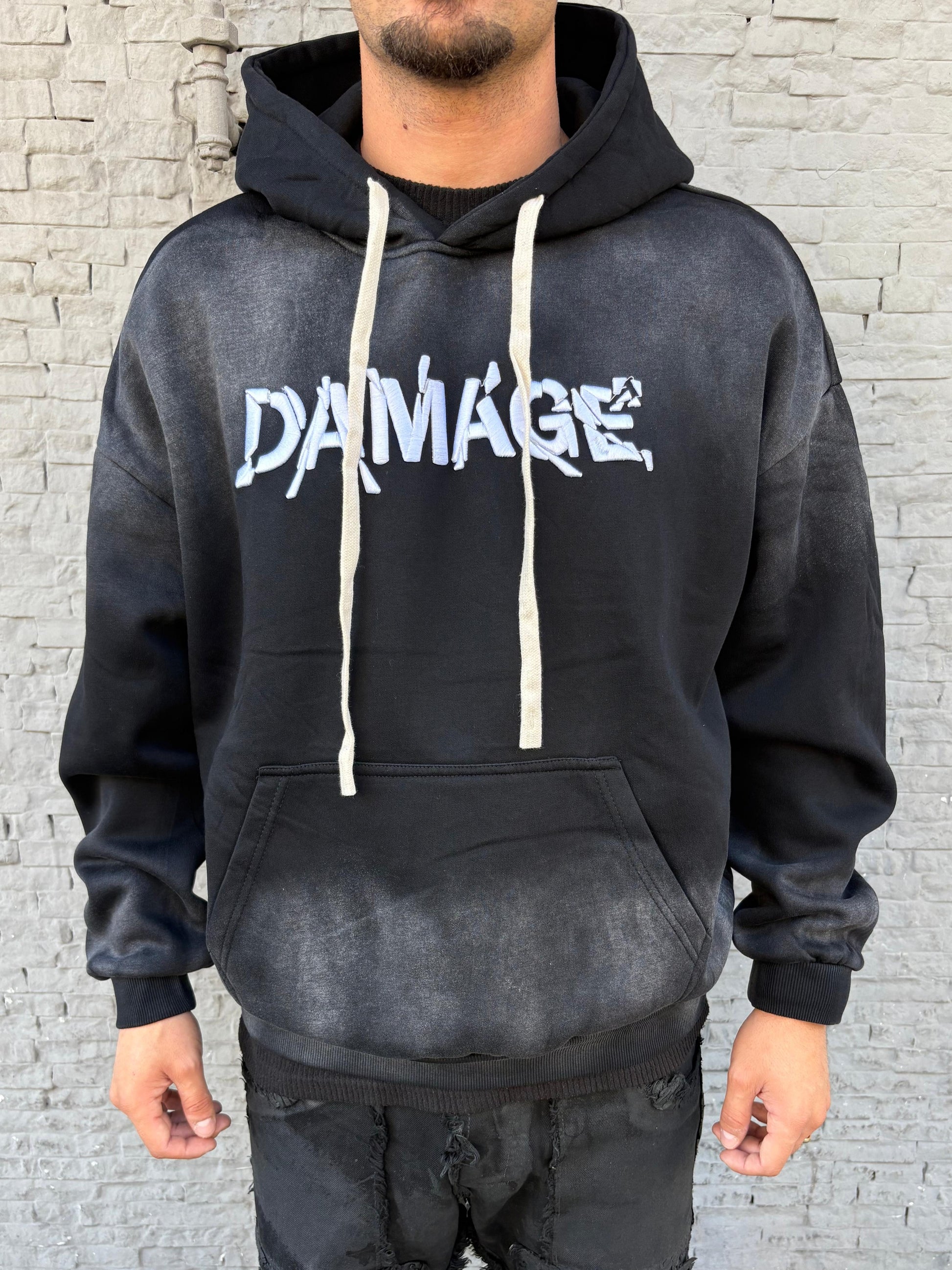 Felpa nera con stampa frontale DAMAGE in stile grunge e finitura washed che crea un effetto vissuto e sfumato unico su petto e maniche. Realizzata in morbido cotone, presenta cappuccio con cordini bianchi, tasca a marsupio e polsini elasticizzati. Taglio oversize per un look urbano e deciso, perfetta con jeans strappati o pantaloni cargo.