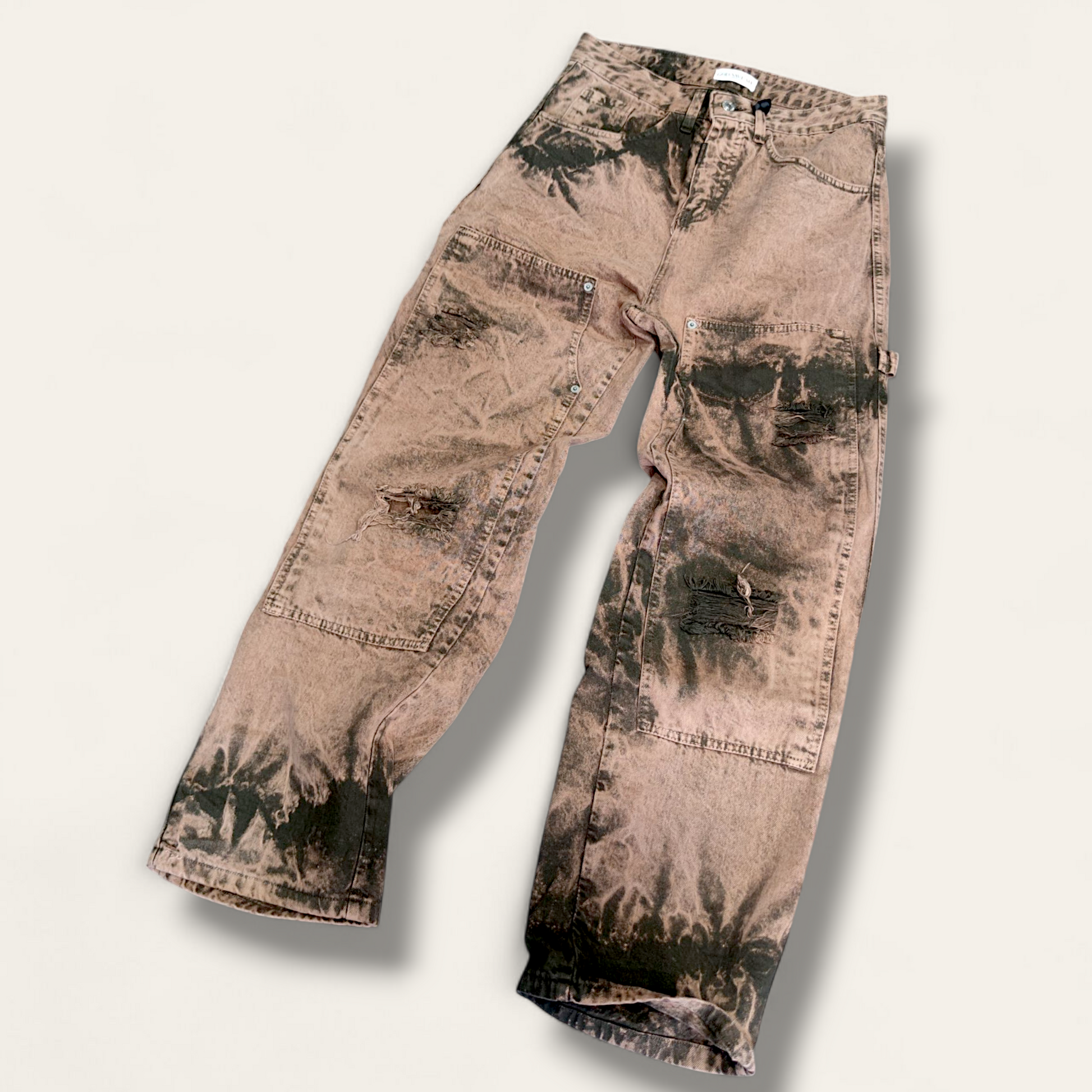 Jeans carpenter con lavaggio tie-dye e dettagli destroyed. Fit relaxed per un look street unico e grintoso.