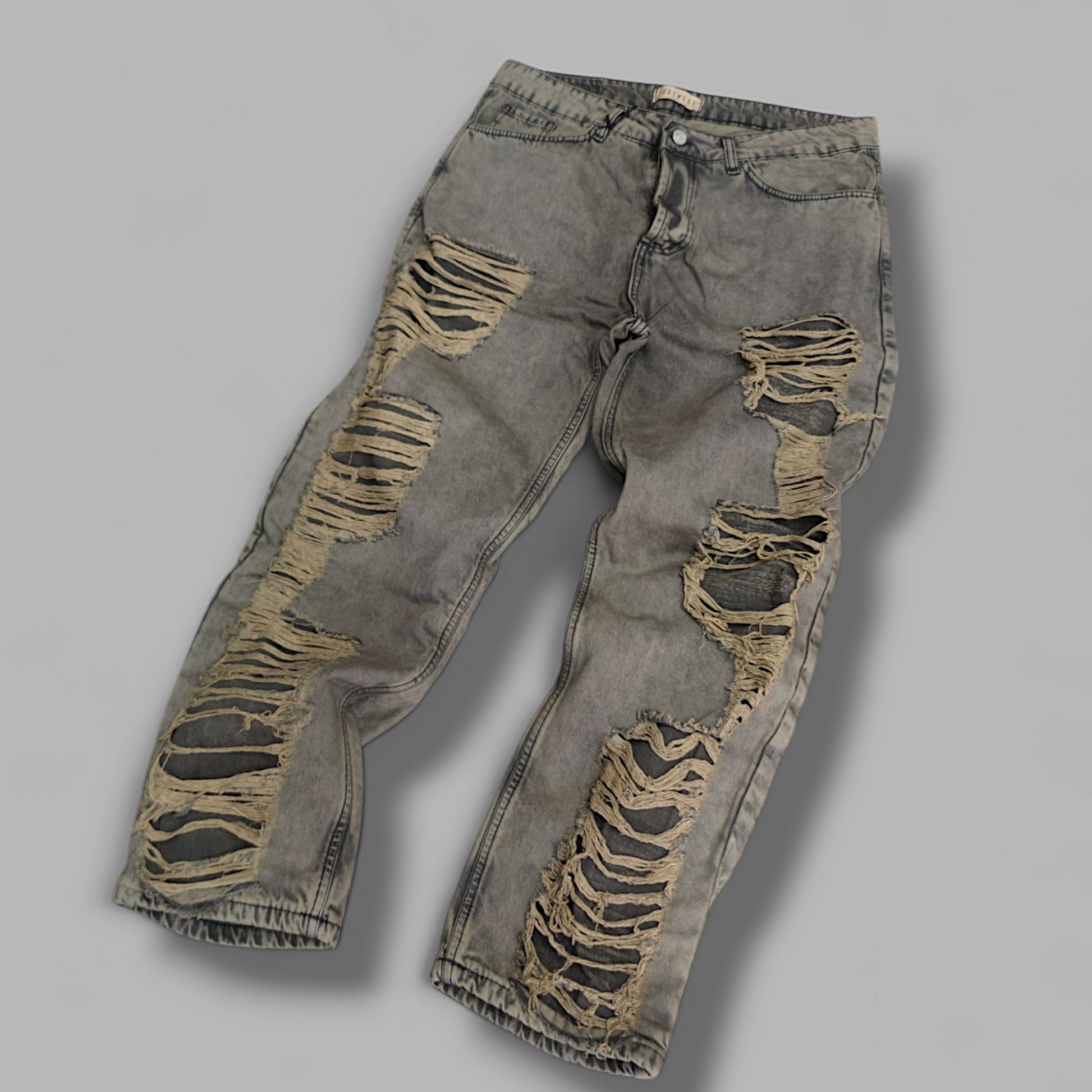 Jeans vintage wash dal look estremo con strappi oversize e fit relaxed. Perfetti per outfit audaci d’ispirazione street e underground.