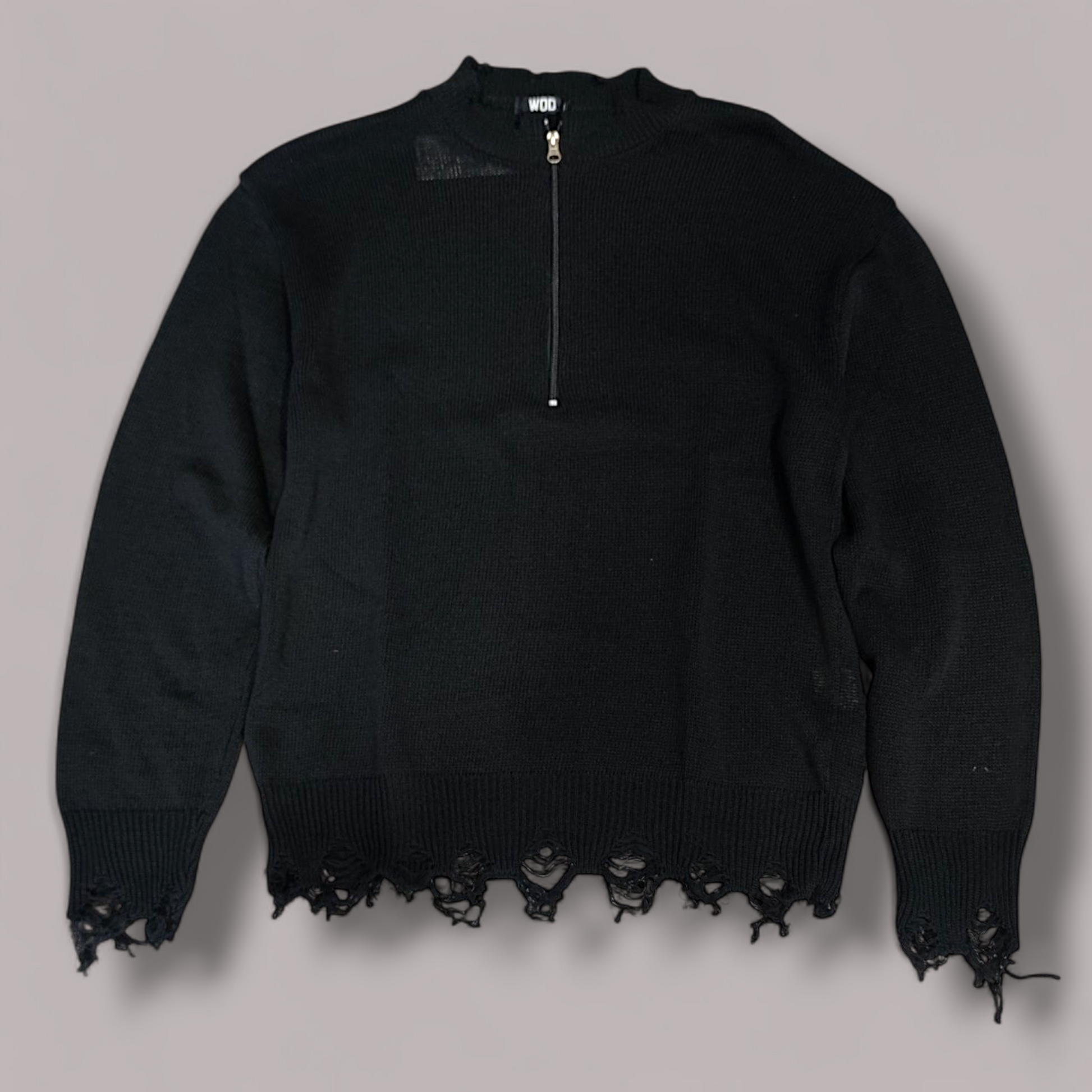 Distinguiti con questo maglione unico nel suo genere. Realizzato in morbido tessuto a maglia, presenta dettagli destroyed su fondo e polsini per un look grunge e di tendenza. La zip frontale a mezza lunghezza aggiunge un tocco urbano e pratico, perfetto per i tuoi outfit streetwear.