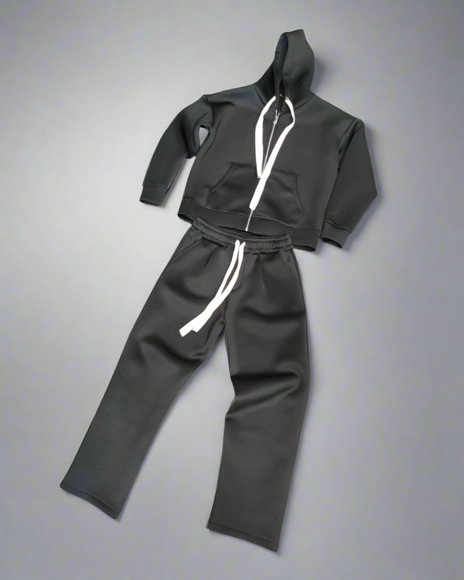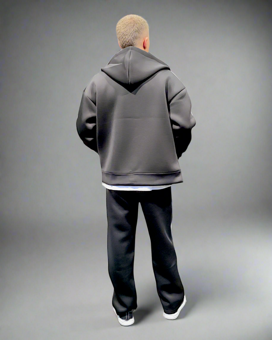 Coordinato completo di Hoodie e pantalone in tessuto scuba effetto lucido nero.